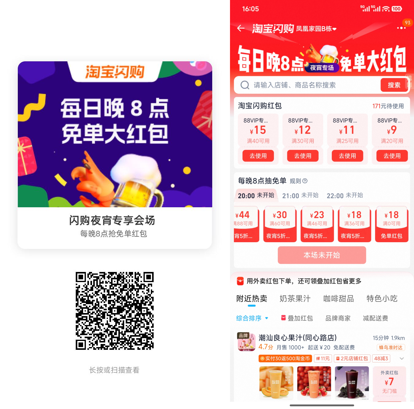 【淘宝闪购夜宵专享抽18-18】淘宝APP闪购搜索“34560”进入活动->20点、21点、22点抽18-18无门槛,未抢到可领夜宵专属5折红包👉