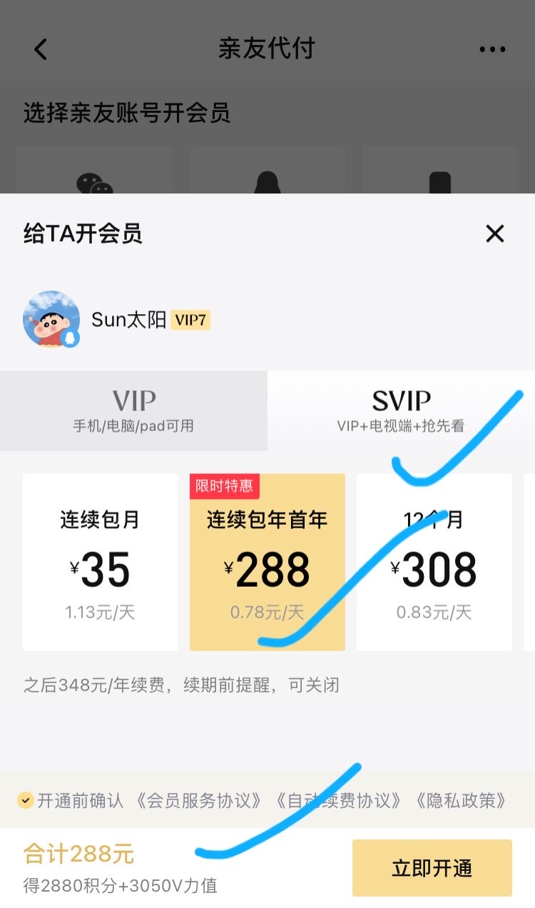 亲友代开的,SVIP成本288,给别人充值大概270上下,也就是冲两单×20,自己花近40,得6000V力值