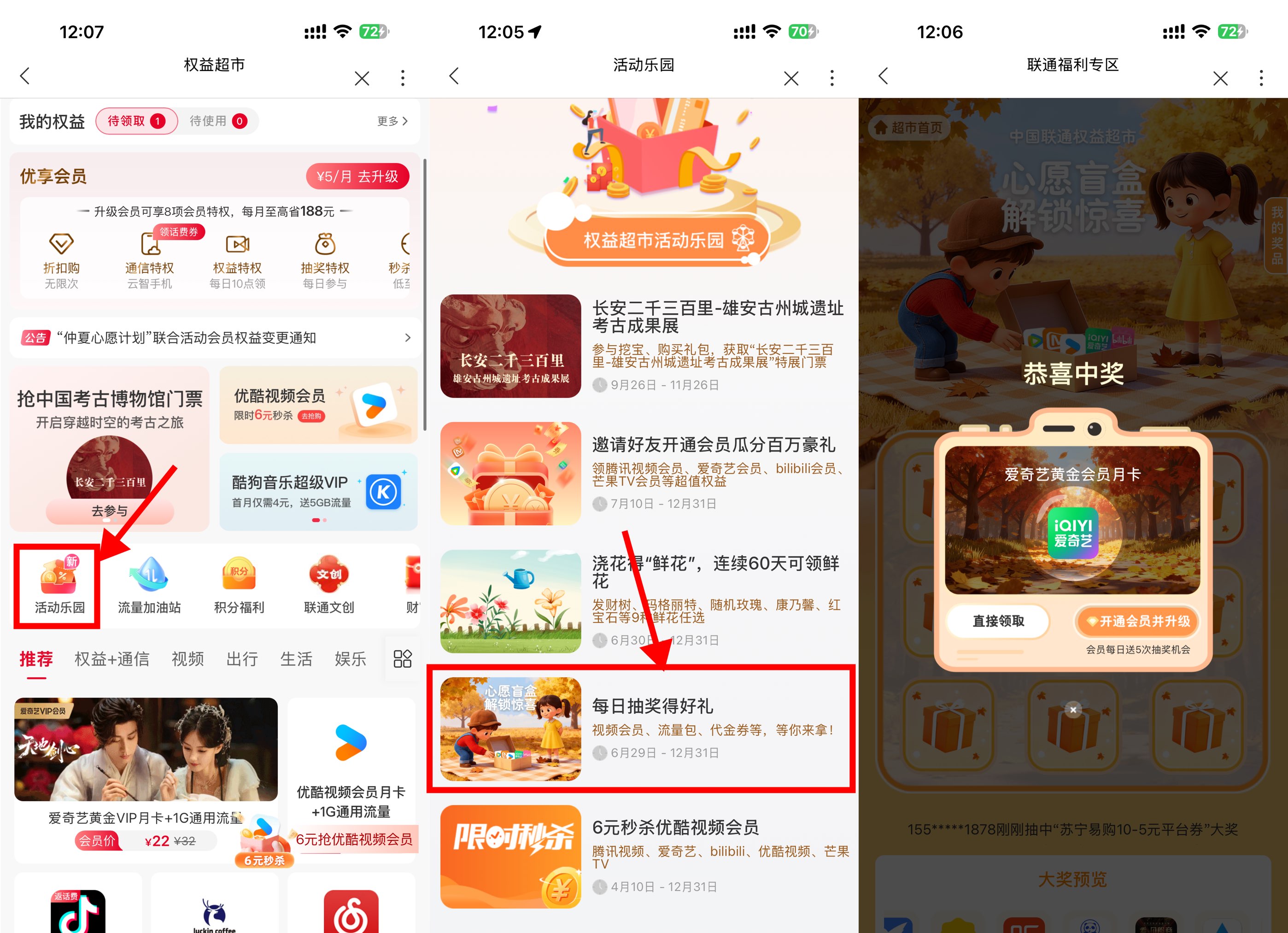 【联通权益超市抽视频会员月卡】联通APP搜索“权益超市”->活动乐园->每日抽奖得好礼->简单浏览得次数,抽爱奇艺或腾讯视频会员等奖励